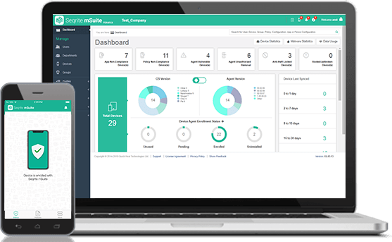 Enterprise mobility management not only creates a safe mobile ecosystem for corporations but also boosts employees’ productivity by keeping important business data secured. Seqrite mSuite enables IT administrators to remotely install work-specific applications that employees can access on-the-go, thus increases efficiency. Seqrite mSuite enables Enterprise Mobility Management that allows you to protect your mobile devices from anywhere – from the boardroom to your vacation. mSuite enables organizations to manage security of enterprise apps on the Android and iOS devices through a unified web console, thus improving the standards of endpoint mobility management. From mobile anti-theft to making your business phone the safest device, Seqrite mSuite has you covered.